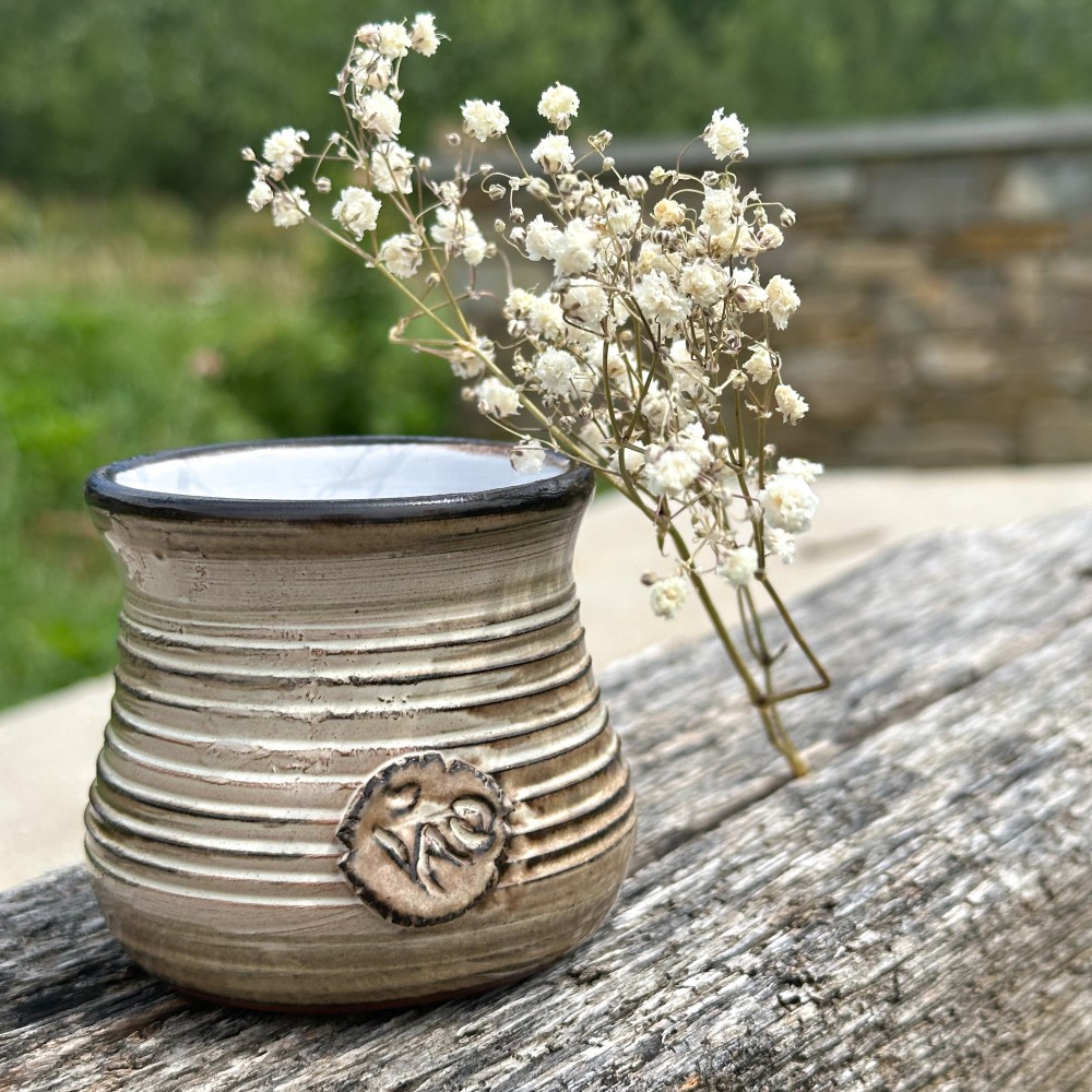Ръчно изработена керамична чаша в бежов цвят с релефна повърхност.