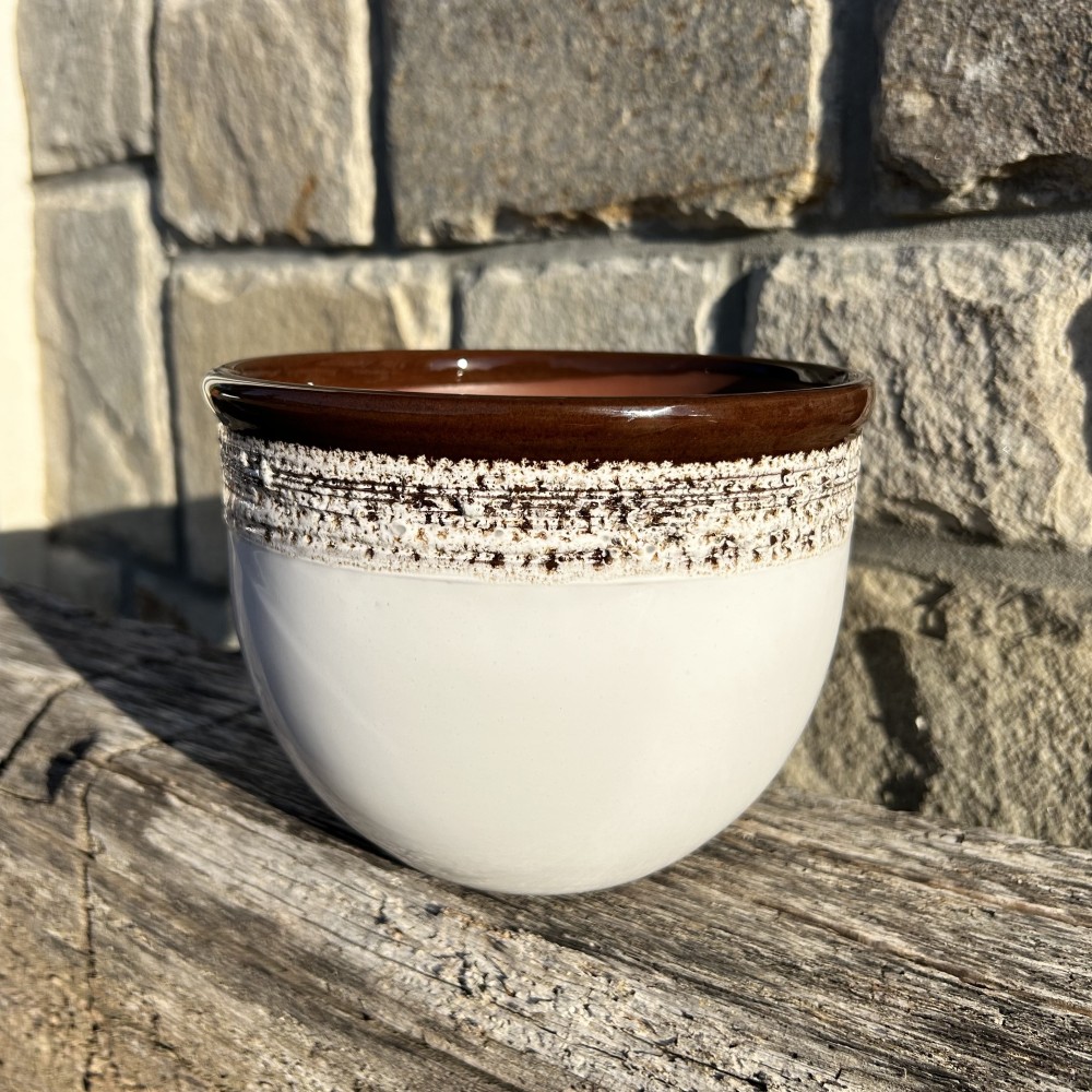Керамична саксия "Антика лента" в бял цвят. Саксията е с гладка повърхност, като има релефна лента за акцент и кафява периферия, която контрастира с основния цвят на саксията. Подходяща е за всякакъв вид цветя, подправки, растения. Предлага се в различни размери*, като може да изберете най-подходящия за Вас от менюто "Опции", където са описани диаметътър и височината. Изпращаме всяка една саксия заедно с керамична подложна чиния.