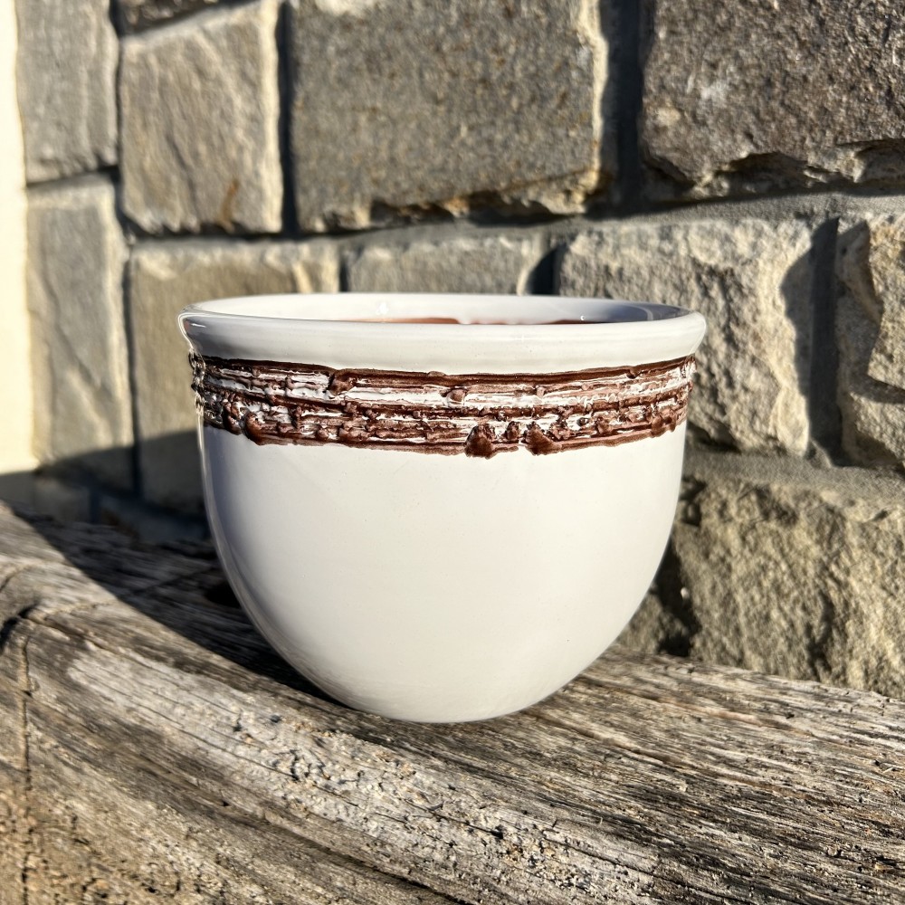 Керамична саксия "Антика лента" в бял цвят. Саксията е с гладка повърхност, като има кафява релефна лента за акцент. Подходяща е за всякакъв вид цветя, подправки, растения. Предлага се в различни размери*, като може да изберете най-подходящия за Вас от менюто "Опции", където са описани диаметътър и височината. Изпращаме всяка една саксия заедно с керамична подложна чиния.