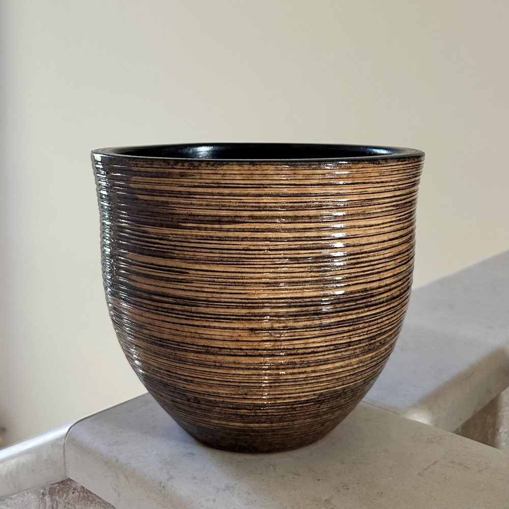 Керамична саксия "Лея" в преливащи се оранжеви и кафяви нюанси и релефна повърхност. Предлага се в 3 различни размера, които може да видите от менюто "Опции".